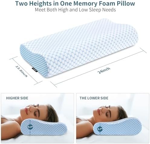 2 HEIGHTS FOR ANY SLEEP STYLES: When you are still troubled about not finding the right height pillow, our bed pillows have 2 different heights(24*13.8*5.3/3.7inch L*H*W) on both sides for you to choose, that you can choose the more suitable height for your sleeping posture and enjoy a comfortable sleep. The adjustable orthopedic pillow for neck pain relief is suitable for side, back, stomach sleepers and low pillow sleepers