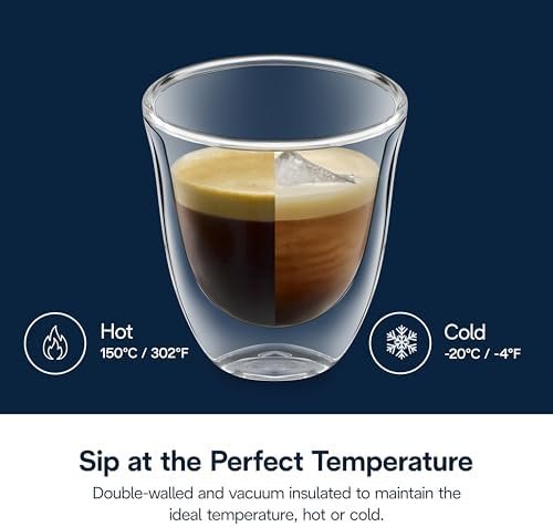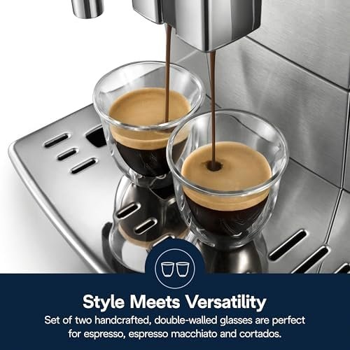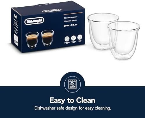 De’Longhi espresso glasses are the perfect gift for any gourmet coffee lover. Made from borosilicate glass, they’re resistant to extreme temperatures and corrosion. The thermal effect of the double wall helps keep hot drinks hot and cold drinks cold. The double wall also prevents condensation and excess heat from reaching your hands. These glasses are comfortable to hold, dishwasher safe and perfect to use with any De’Longhi specialty coffee maker. Each box contains two espresso glasses.