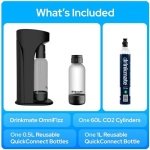 WHAT’S IN THE BOX: Drinkmate OmniFizz sparkling beverage maker, 2 reusable BPA-Free Carbonating Quick-Connect Bottles (1x 1L and 1x 0.5L), 1 Fizz Infuser, and 1 60L CO2 Cylinder. **Color of 0.5L bottles chosen at random.**