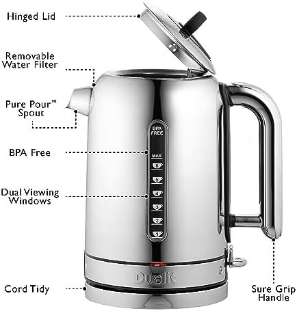FAST PATENTED WHISPER BOIL: The Classic Kettle is the quietest kettle that Dualit has designed and drastically reduces boiling noise. Designed to be not only quiet but fast, it can boil enough water for two full cups in less than a minute and a half.