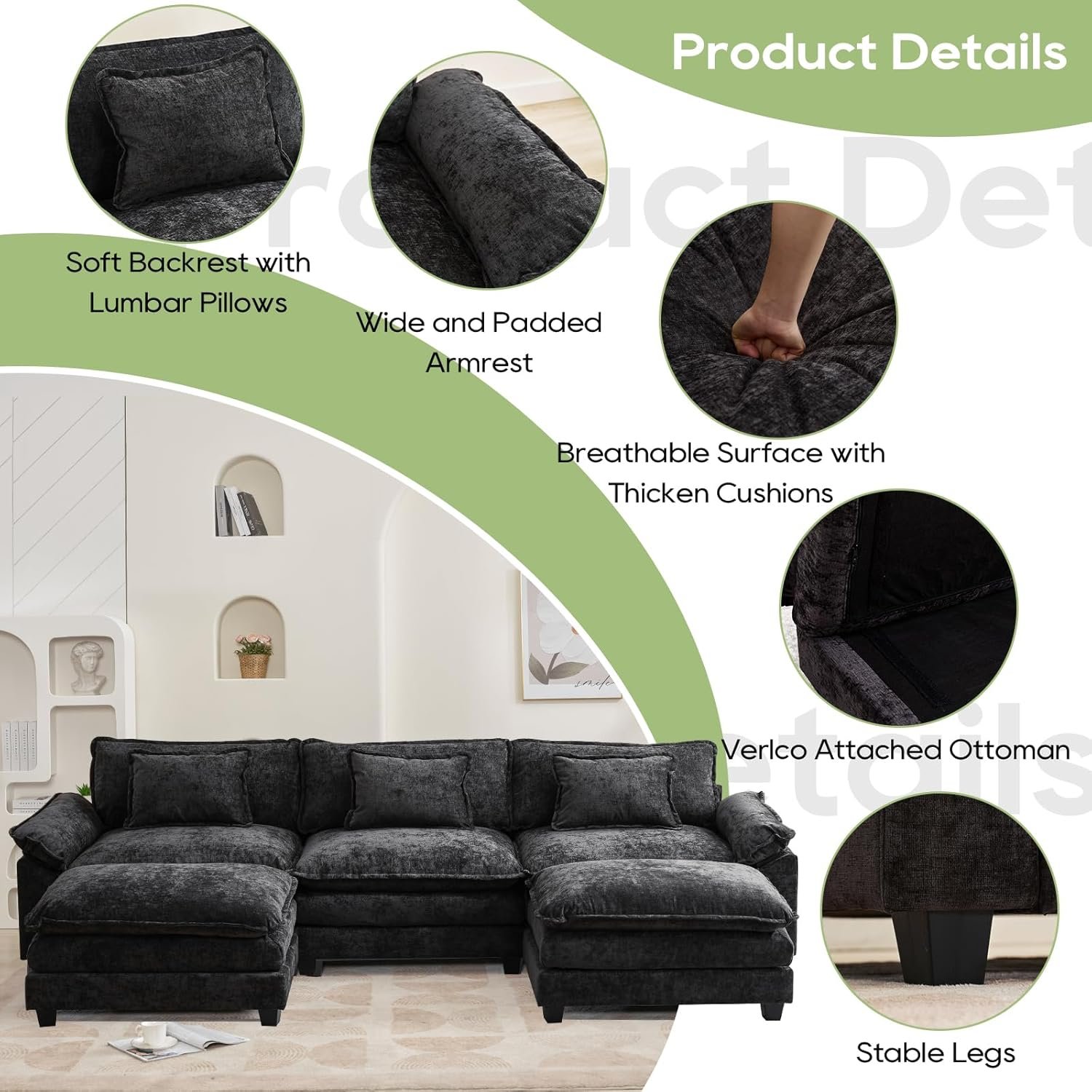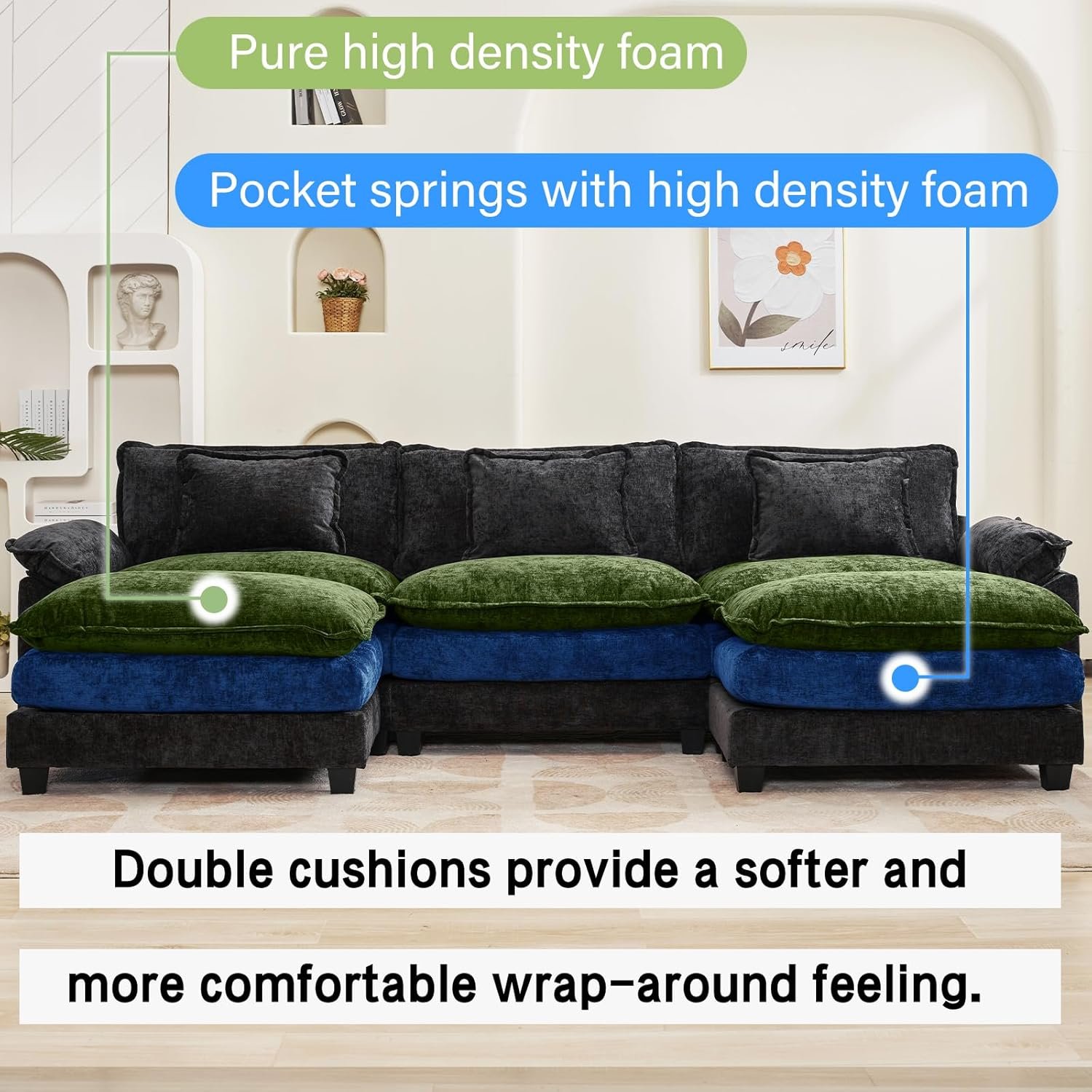 Morden And Elegant: The cloud couch is available in premium chenille fabric, the sleek look is complemented by sofa colors for a sophisticated modern style and a warm, cozy atmosphere, making this sectional sofa beautiful and comfortable