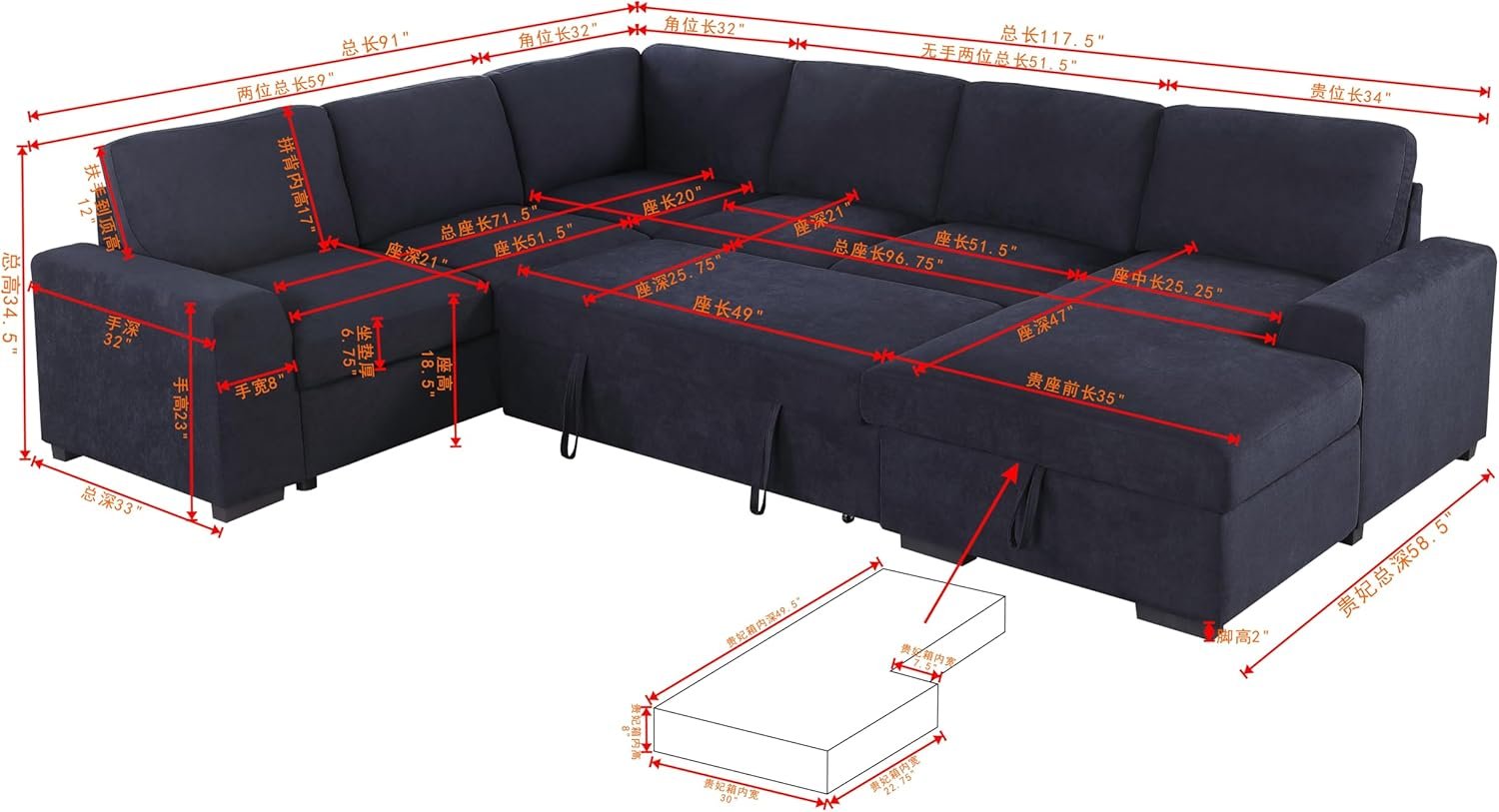 Easy Assemble Oversized Convertible Sleeper Sectional Sofa Bed :Overall sofa size:117.5″*91″*34.5″H.We have provided all the necessary installation tools. It is recommended that two people install this sectional sofa bed together. This sofa comes in 4 packages, these packages may not arrive on the same day. Please wait until all the packages have arrived before starting the installation.
