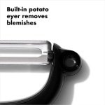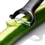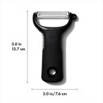 “Y” Peeler. 5.75″/14.5cm, black, stainless steel blade. Includes a built-in eyer and features a sharp stainless steel blade that glides through even the toughest fruit and vegetable skins with ease. The soft, comfortable handle cushions your hand as you peel, and is non-slip, even when your hands are wet. Dishwasher safe.