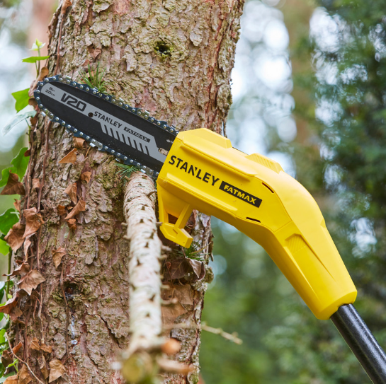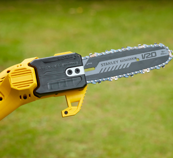 The 18V Stanley FatMax V20 20cm Cordless Pole Saw with improved battery technology, no memory effect and minimal self-discharge, features the new V20 lithium-ion battery pack that is ready to go to work whenever you are and wherever the job takes you. The cordless pole saw has a 20cm bar and chain that provides efficient cutting for smaller, out of reach branches along with up to 3.4m of extended reach to cut hard to grasp hedges giving a total reach of up to 4.5m. Complete with an angled head and blade to provide a precise cut for awkward to reach branches and a chain brake safety mechanism that stops the chain in less than 1 second, tooled for accurate chain adjustments. This long reach trimmer features an integral battery state of charge indicator for convenient monitoring of battery charge levels and is fitted with an integrated hanging hook for safe storage, which is compatible with the Stanley Track Wall System – a versatile, adaptable storage system for the home, garage or workshop. Part of the new 18V Stanley FatMax V20 Cordless System – power all your V20 tools with a common new and improved 18V lithium-ion battery to let you power through gardening with ease.