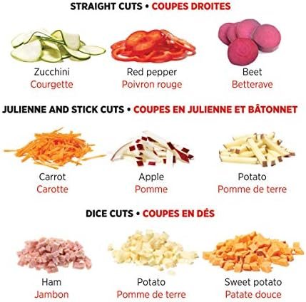 Adjustable blades to set slice thickness from 0.5 mm to 8.0 mm, also dices and juliennes